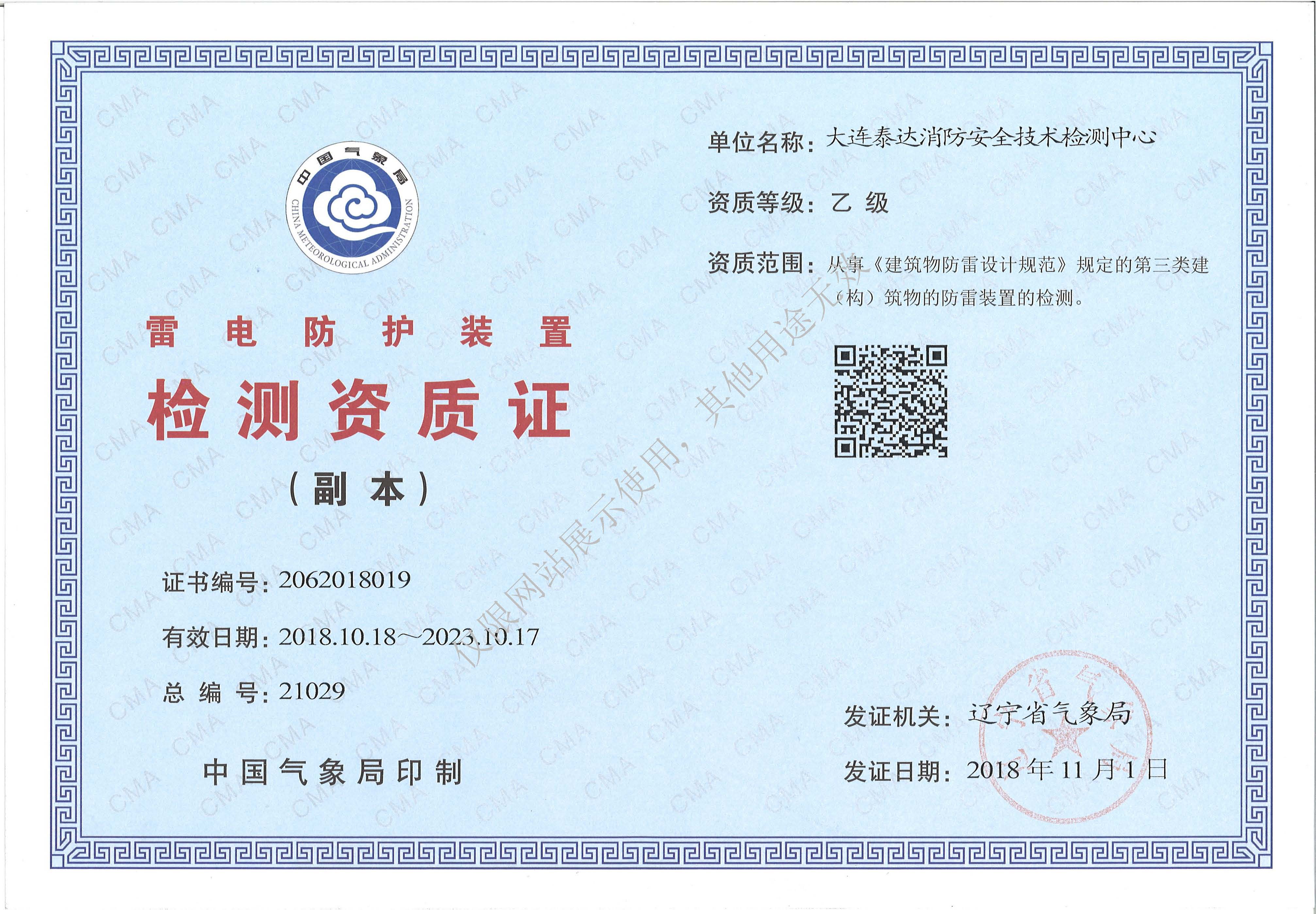 · 是經“社會消防技術服務信息系統(tǒng)”備案并公示的消防技術服務機構,已取得中國氣象局頒發(fā)的雷電防護裝置檢測資質證書、遼寧省質量技術監(jiān)督局審核批準的檢驗檢測機構資質認定證書(CMA)及包括消防檢測、電氣檢測、雷電防護裝置檢測、防火涂層厚度檢測等在內的200余項檢驗檢測能力,取得大連市應急管理局頒發(fā)的安全生產標準化證書,獲得質量管理體系、環(huán)境管理體系、職業(yè)健康安全管理體系認證證書,是經備案的高新技術企業(yè),可獨立出具具有證明作用的檢測報告。